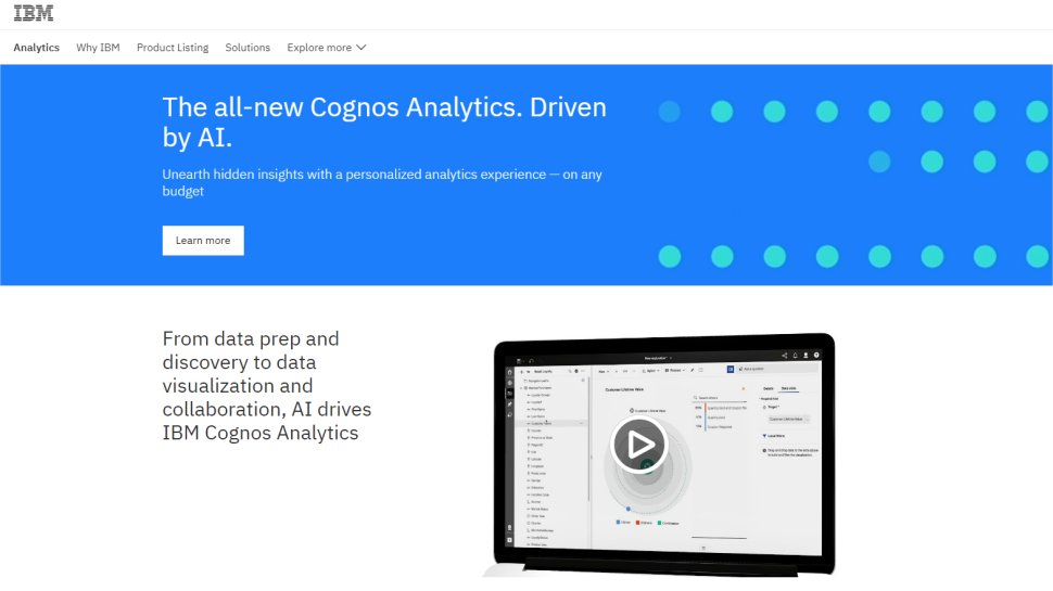 IBMâs Cognos Analytics[/URL] is a business intelligence platform and self-service analytics solution that uses AI and machine learning. The aim is to discover patterns of information other products cannot find using advanced pattern detection, and provide both answers and actionable insights through the natural language-powered AI assistant.