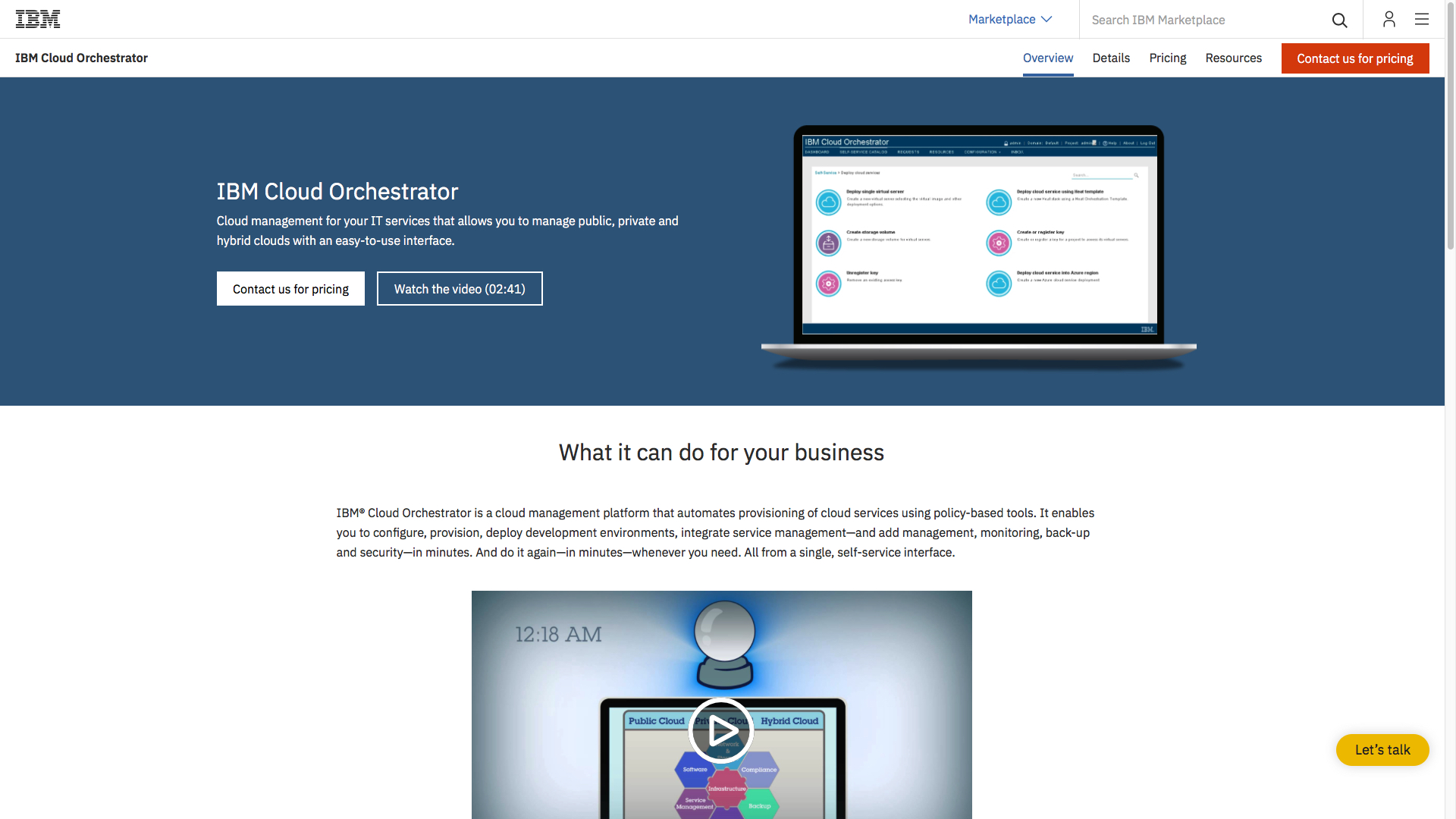 IBM Orchestrator is available in two custom priced packages. They both offer a customizable self-service portal, advanced orchestration platform, IT processes automation, support for VMware and multi-cloud management. Users need to contact IBM directly for more information.
